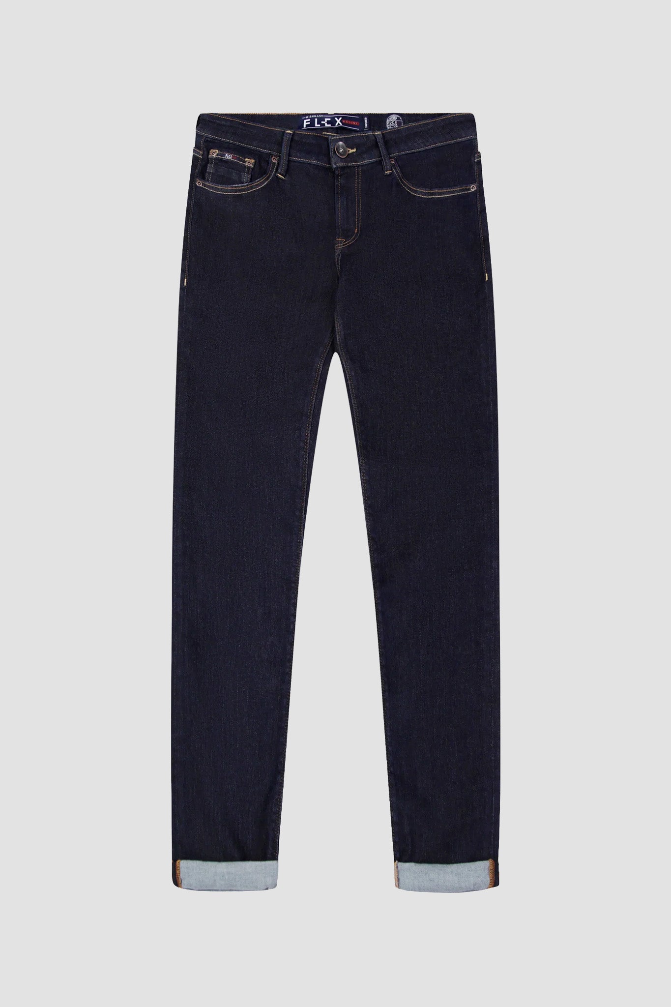 Stretchability 70% to 80%. This jean has an indigo warp, indigo weft yarn and washed to keep its dark base, with high-stretch this Flex active allows the wearer to be able to mover effortlessly. Rinse washed only for a Dark clean base, no sanding, no whiskers for that natural look.