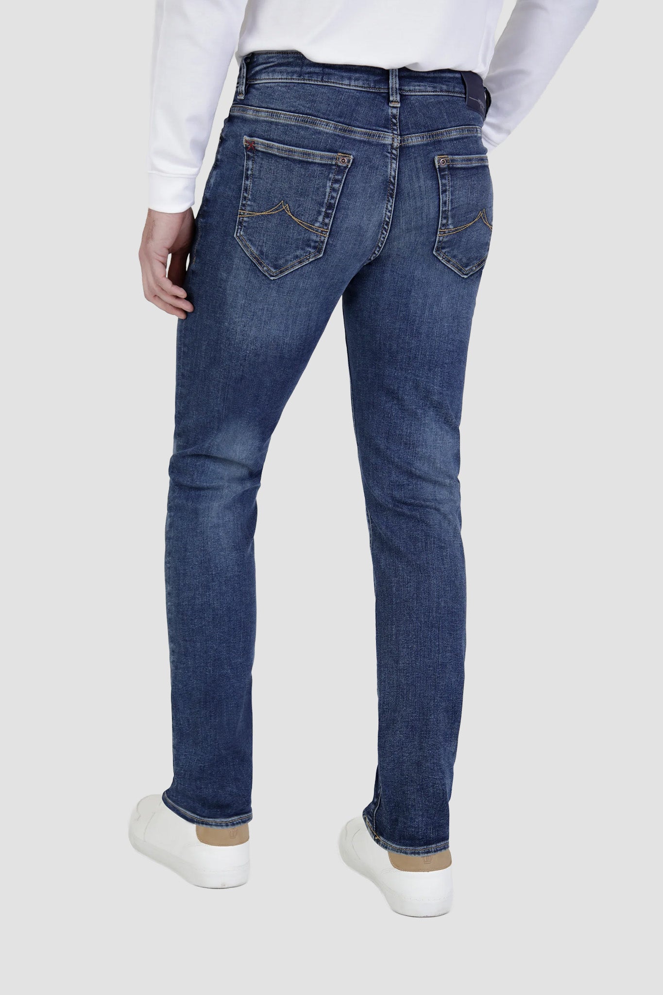 Stretchability 70% to 80%. This jean has been washed to a mid-blue tone with contrasting abrasions and wear marks. The hand finished wash effects add a faded-blue contrast that gives the jeans a depth of high and lows within the indigo, completed with subtle 3D creases. Stitching to compliment the denim shade.