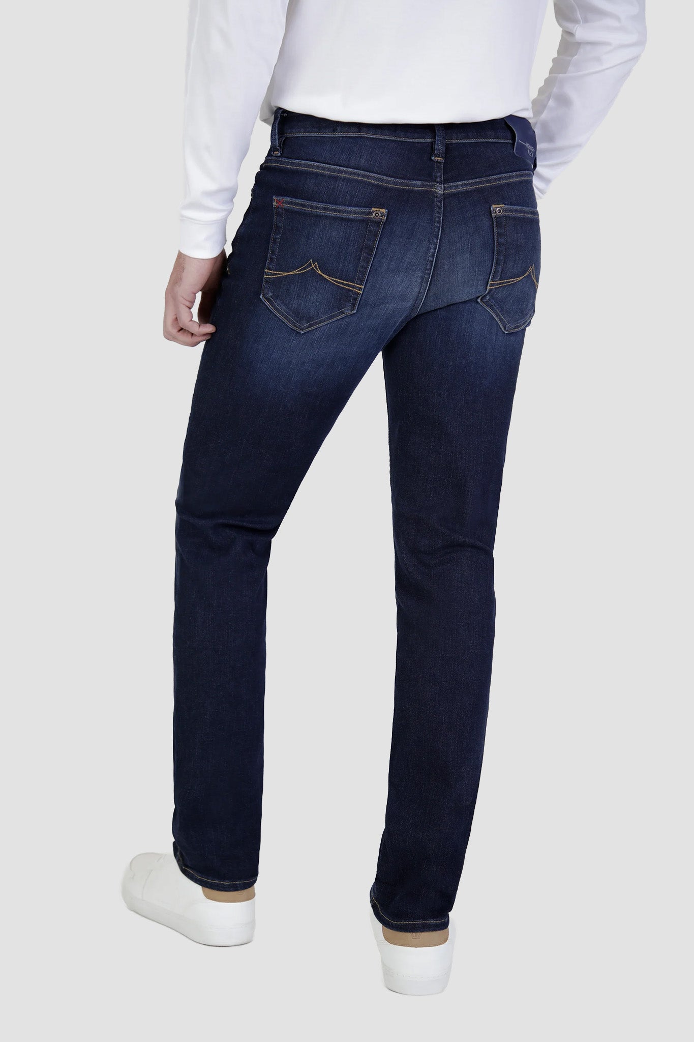 Stretchability 70% to 80%. This jean has been washed to a dark blue tone with contrasting abrasions and wear marks. The hand finished wash effects add a faded-blue contrast that gives the jeans a depth of high and lows within the indigo, completed with subtle 3D creases. Stitching to compliment the denim shade.